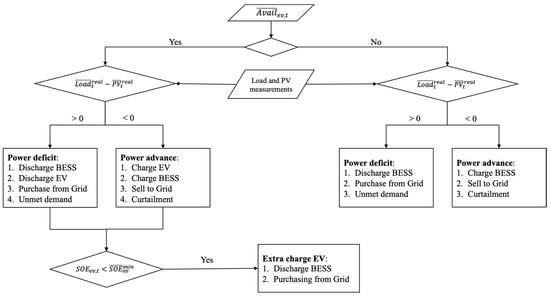 The second layer of the home EMS is a rule-based control algorithm that refines the optimal setpoints obtained from the first-layer MILP model. Its primary function is to manage the net demand forecast error—caused by inaccuracies in predicting PV generation and household consumption—by redistributing this error among system components while respecting their technical limitations. This layer dynamically adjusts power setpoints based on real-time system measurements, ensuring an effective interaction between the BESS and the EV in maintaining home energy balance.