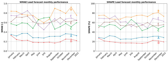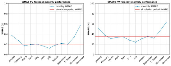 Edison provided data concerning the PV production forecast and measurements, referencing a PV field situated in the north of Italy. Both forecasts and measurements have been rescaled to a nominal power consistent with the typical size of PV fields in Italian households, following [43]. In Figure 6, the monthly forecast performance is evaluated in terms of SMAPE and WMAE. As depicted, the SMAPE hovers around 30%, and the WMAE is around 0.2, with the lowest performance observed in the months of December and January.
