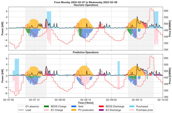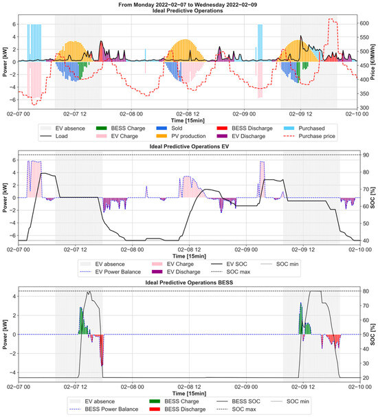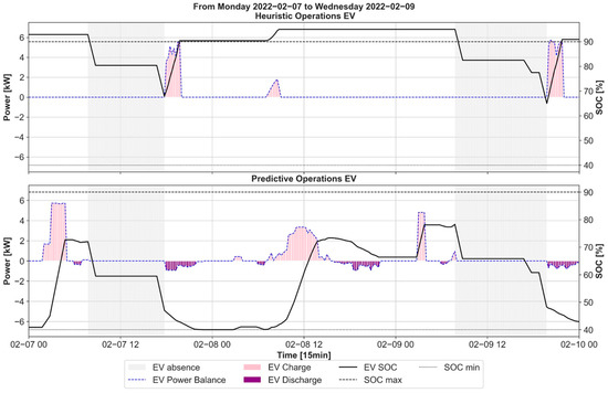 As for the EV, unfortunately, the number of clients with EV is insufficient to derive a consistent methodology for forecasting EV usage (availability time and consumed energy). Thus, the EMS has been tested assuming a set of four different EVs’ expected usage profiles, as detailed in Section 3.5. Additionally, the economic impact of EV usage forecast errors has been assessed for different error scenarios for both a winter week and a summer week, as discussed in Section 4.7.