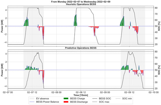 The computed and , shown in Equations (3) and (4), determined at the beginning of this second layer, represent the expected energy levels of the BESS and EV if they were to fully adhere to the first-layer setpoints. The adjustments in power setpoints, Equations (5)–(8), ensure compliance with technical constraints and the optimization strategy.