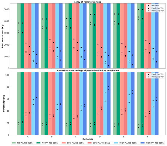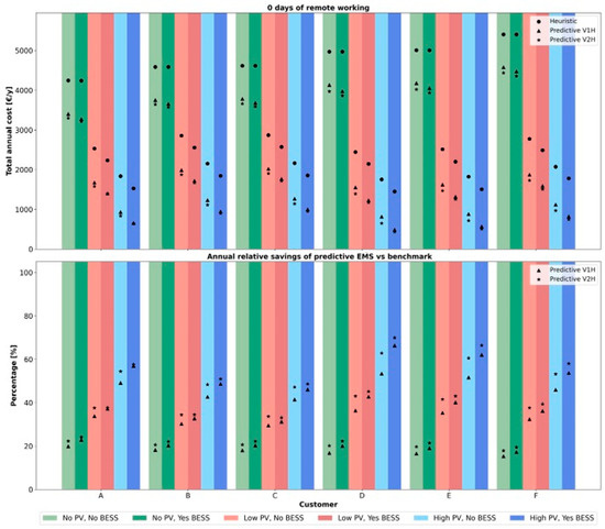 Each case study differs in terms of users’ weekly commuting habits (ranging from no remote working days to three days per week). A reference case has also been included, denoted as case 0, in order to address scenarios with no electric mobility. Assessing this simpler design is essential for understanding the impact of increasing system complexity in terms of components and management strategies. Additionally, this case offers a reference point for calculating the costs and revenues associated with the annual energy consumption of various users in the analyzed configurations, facilitating the computation of the electric mobility effect in subsequent cases. Each case study aims to assess the techno-economic performance of six users in various smart home configurations. The objective is to evaluate the benefits offered by the proposed HEMS in comparison to a benchmark heuristic algorithm.