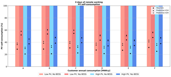 In addition to evaluating the economic feasibility of the different configurations for each case study, it is necessary to quantify the self-consumption of PV generation as well. Given that grid power injection has been constrained to the net power excess between residential consumption and PV generation, BESS and EV cannot be discharged to sell electricity to the grid. This implies that PV self-consumption can be easily derived from the difference between the energy generated with PV and the electricity injected into the grid: