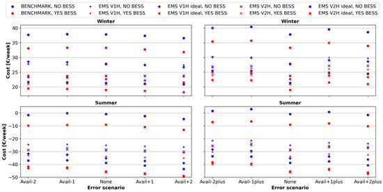 Total weekly operating costs of the tested EMS during a winter and summer week of user E, equipped with a 6 kW PV field, for different EV forecast error scenarios.