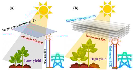 Schematic diagram showing (a) the conventional single non-transparent PV blocking sunlight and reducing yield, and (b) 3D-Solar with multiple transparent PVs for enhanced yield and PCE [29].