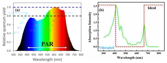 The efficiency of photosynthesis strongly depends on the light wavelength. Studies [30] show that photosynthetically active radiation (PAR) exists in the 400–700 nm range (Figure 3), which is the most effective spectral region for driving photosynthesis. Light below 400 nm or beyond near-infrared (NIR) 700 nm is much less effective due to the lower quantum yield of CO₂ assimilation when applied as a single waveband (Figure 3a). Red light (600–700 nm) exhibits the highest quantum yield, which is the most efficient for photosynthesis. Blue light (400–500 nm) is also very effective, with strong absorption by green leaves. As can be seen in Figure 3a, the percent quantum yield (PQY) of green light (500–600 nm) is slightly lower than that of blue light, attributable to its lower absorptance by plant leaves. Green light is the least absorbed but mostly reflected, which is responsible for leaves’ characteristic green appearance. Based on these absorption characteristics, solar panels can be designed to selectively transmit or filter light, maximizing energy generation and enhancing plant growth.