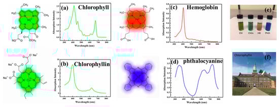(a) Chlorophyll structure and absorption; (b) chlorophyllin structure and absorption, (c) hemoglobin and absorption, (d) phthalocyanine and absorption, (e) solutions of these porphyrin compounds, and (f) a photograph of chlorophyllin thin film in front of campus buildings, showing their high transparencies (AVT = 85%) [52].
