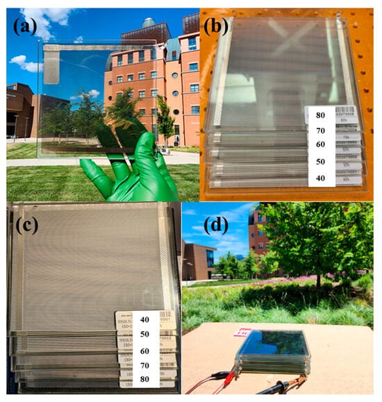 Photographs of (a) 80% CdTe solar panels on campus; (b) five CdTe solar panels stacked in parallel with descending transparency: 80%, 70%, 60%, 50%, and 40%; (c) five CdTe solar panels stacked in parallel with ascending transparency: 40%, 50%, 60%, 70%, and 80%; (d) I-V measurement set for five CdTe solar panels stacked in parallel [29].