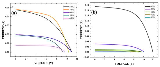 The I-V curves of the stacked panels in both descending and ascending orders were also measured, as shown in Figure 6. Since some of the CdTe solar panels are only semi-transparent, significant light attenuation occurs as light passes through successive layers. As shown in Figure 6a, the I-V characteristics align with the measured light power densities for each solar panel. In the descending configuration, where the most transparent panel is on top (55.4 mW/cm2), the short-circuit current (Isc) gradually decreases through the subsequent layers. Despite this reduction, all panels maintain appreciable current levels. Similarly, in the ascending configuration (Figure 6b), where the least transparent (40%) panel is positioned at the top, the I-V curves again correspond to the light power densities. The top panel exhibits the highest power conversion efficiency (PCE), but due to its low transparency, the Isc values of the underlying panels drop significantly, as detailed in Table 2. Consequently, the maximum power output (Pmax) of the lower panels is also markedly reduced, consistent with the declining light power densities shown in Table 1.