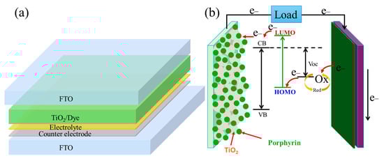In the structure of a dye-sensitized solar cell (DSSC) [54,55,56,57,58,59,60,61], the photoanode is made of TiO2 nanoparticles coated with a dye sensitizer (Figure 7a). The porphyrin compounds are applied in DSSC as dye sensitizers due to their unique absorption characteristics. A redox electrolyte plays a crucial role via efficient dye regeneration and minimization of charge recombination. The counter electrode facilitates the regeneration of the dye and electrolyte. Transparent conducting oxide (TCO) allows light to pass through while also acting as an electrode. Figure 7b depicts the operational mechanism of DSSC [50]. When DSSC is exposed to either sunlight or indoor LED light, electrons within the dye molecules are excited from the ground state (HOMO) to the excited state (LUMO). The excited dye molecules lose electrons (oxidation) that are subsequently injected into the conduction band of the TiO2 electrode. The electrons are transported to an external circuit and the counter electrode through the transparent conducting oxide (TCO). Through the redox electrolyte, the oxidation of I− ions produces I2, which then forms I3− in equilibrium. The I3− ions migrate toward the counter electrode, where they regain electrons and are reduced back to I−.