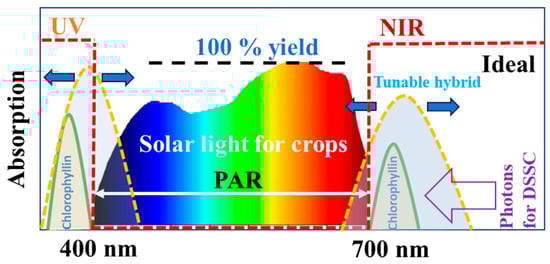 For agrivoltaics, the DSSC must be designed according to the ideal spectrum, as shown in Figure 8. Since photosynthetically active radiation (PAR) is primarily concentrated between 400 nm and 700 nm, the ideal DSSC should allow most of the light between 400 nm and 700 nm to pass the solar cells for crop photosynthesis. Therefore, the key considerations include the following: (1) the DSSC must exhibit high AVT in the visible range, ideally with high transmission between 400 nm and 700 nm. This is to ensure maximum agricultural yield; (2) to achieve high PCE, multiple DSSC panels can produce electricity collectively, as demonstrated in Table 3; (3) while passing most of the visible light to the crops below the PV system, UV and NIR light should be mostly absorbed by the hybrids (highlighted by the dashed yellow line peaks in Figure 8). These optical characteristics can be obtained via systematic investigation into hybrid design, synthesis, and characterization based on the spectra of various components. Different porphyrins with compositional variations can be developed to alter the overall absorption spectra according to the ideal condition, as depicted in Figure 8. Other compounds, such as Fe3O4@Cux-2S, can also be applied in the hybrids, since this compound exhibits broad IR absorption near 1300 nm [47,48,49,50,51,52,53]. For example, both chlorophyll and chlorophyllin exhibit minor absorption peaks in the NIR region, while Fe3O4@Cux-2S can extend abortion in much longer wavelengths. Therefore, a hybrid between chlorophyllin and Fe3O4@Cux-2S may result in more ideal absorption spectra, as shown in Figure 8. In this way, we can develop spectral tunable hybrids for ideal PV electricity generation and crop yield at the same time.