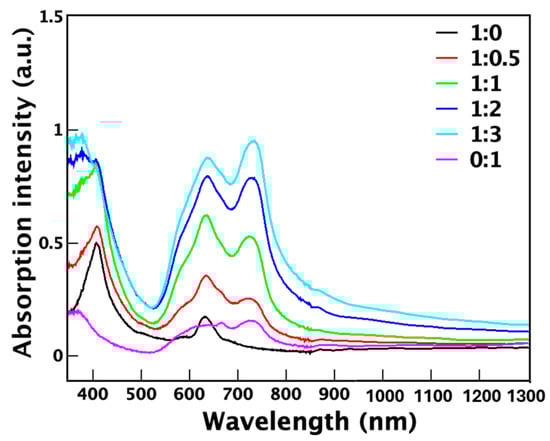 Preliminary findings on porphyrin hybrid absorption behaviors are presented in Figure 9 [31]. As illustrated in this figure, varying the chlorophyllin-to-phthalocyanine ratio significantly alters the absorption characteristics of the base porphyrin. The pure chlorophyllin sample (black curve, 1:0 ratio) exhibits two primary absorption peaks near 400 nm and 650 nm. As increasing amounts of phthalocyanine are blended with chlorophyllin, NIR absorption progressively intensifies due to their structural similarities. Notably, at a 1:3 ratio (cyan curve, Figure 9), the NIR absorption reaches its highest level among the tested compositions.
