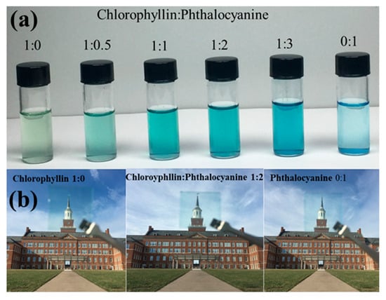 Figure 10 presents the hybrid solutions and films, with chlorophyllin-to-phthalocyanine ratios indicated. As seen in Figure 10a, the solutions exhibit a uniform blend of both porphyrin compounds without precipitation, attributed to their structural compatibility. Additionally, the films maintain an AVT of 85%, as shown in Figure 10b. By carefully controlling film thickness and ensuring homogeneity in the hybrid solutions, even higher AVT levels can be achieved.
