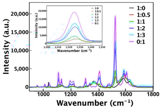 Raman scattering has been applied to study the compositional characteristics of the hybrids. In Raman scattering, the incident laser light interacts with the molecular framework, inducing vibrations in the porphyrins that are linked to the system’s phonons and electrons, leading to an energy shift in the scattered photons. When another porphyrin, such as phthalocyanine, is introduced into the chlorophyllin-based hybrid, modifications occur in the molecular vibration modes of chlorophyllin, which are reflected in the Raman spectrum. To investigate if the components are congruently joined as a hybrid, we conducted the Raman characterization on the chlorophyllin:phthalocyanine hybrids excited by a 442 nm laser. As shown in Figure 11, one of the Raman peaks is presented for hybrids of different proportions. As the composition transitions from pure chlorophyllin (1:0) to pure phthalocyanine (0:1), the peak at 1525 cm⁻1 is systematically modified. When the phthalocyanine fraction increases, this peak intensifies, as observed in the spectra for ratios of 1:1 (green), 1:2 (blue), 1:3 (cyan), and ultimately 0:1 (purple). The progressive enhancement of this Raman peak confirms a gradual structural incorporation of phthalocyanine into the chlorophyllin base solution.