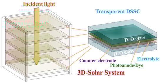 The power conversion efficiency (PCE) can be improved by utilizing a multilayer solar harvesting approach, as illustrated in Figure 12 [29,47,48]. In this configuration, solar light passes through multiple transparent photovoltaic (PV) films within a confined three-dimensional (3D) space, generating electricity on each PV panel. By ensuring transparency across all PV panels, the effective surface area exposed to sunlight increases within a given volume. Consequently, the multilayer structure in Figure 12 serves as a solution to the inherently low PCE of organic photovoltaics (OPVs). This strategy effectively shifts the PCE evaluation from a conventional two-dimensional (2D) single-layer framework to a 3D solar architecture. Building upon the multilayer PV film approach outlined in Figure 5, it is possible to integrate transparent dye-sensitized solar cells (DSSCs) within the 3D-Solar framework depicted in Figure 12. Our primary focus will be on utilizing transparent porphyrin compounds, such as chlorophyllin, to develop DSSCs with enhanced optical and energy-harvesting properties.