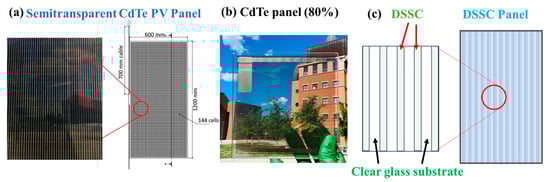 (a) Photograph of a semitransparent CdTe panel with 144 cells; (b) a photograph of CdTe panel with 80% AVT; (c) schematic of DSSC with patterned grids.