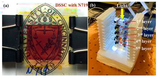 (a) Photograph of a single DSSC with N719 over the logo of University of Cincinnati and (b) 3D-Solar system with five N719-DSSCs in parallel [47,48].