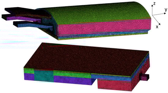 The computational domain includes both the combustion chamber and the molten glass bath, with each region discretized using an unstructured mesh composed of tetrahedral elements, created in Ansys ICEM CFD v. 17.1. In the combustion chamber, which encompasses the air and exhaust vents, as well as the fuel burner housings, a range of mesh densities was applied. Near the walls, the mesh was refined with prism layers to maintain a y+ value of around 30, ensuring the proper activation of the wall functions. For the glass bath, the mesh was created to align the elements on the glass surface with those in the domain above. Starting from this surface, prism layers were added to accurately capture the thermal gradient within the molten glass. The combustion chamber mesh consists of approximately 4 million elements, while the glass bath mesh contains 1.7 million cells. These grid configurations were selected based on a mesh sensitivity analysis carried out in previous studies [34,39,40]. A visual representation of the meshes in both domains is shown in Figure 2.