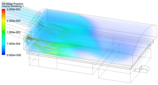 This section presents the primary outcomes derived from the glass furnace model as applied to the industrial case described above. Comparisons with experimental measurements are shown, providing a reference for the procedure evaluation. In Figure 3, the volumetric rendering of OH mass fraction in the combustion chamber is depicted as the primary indicator of the structure of the flames.