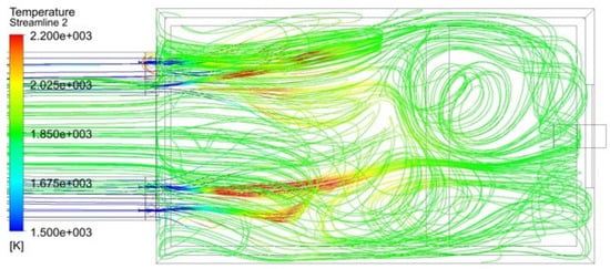 This visualization reveals the development of two diffusive flames, generated by the intricate interaction between the preheated combustion air from the two towers and the fuel jets from the burners. The presence of flames is evident in the regions with the highest OH radical concentrations, particularly in the zone just downstream of the burners, extending to nearly half the furnace length. Figure 4 displays the streamlines within the combustion chamber, originating from the air vents and burners, with colors indicating temperature variations.