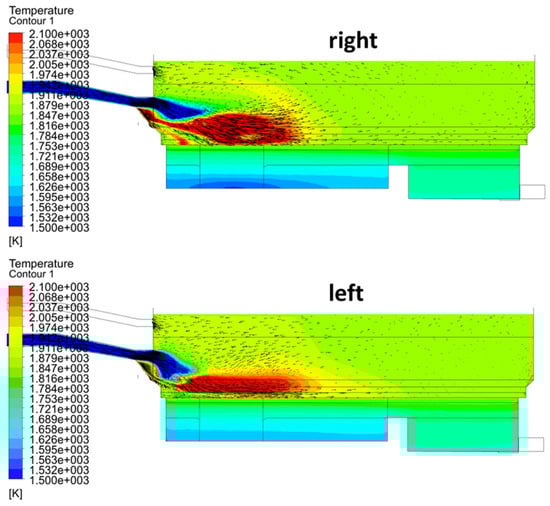 For a detailed visualization, Figure 5 presents the temperature contours in the combustion chamber (with superimposed the velocity vectors) and glass bath, depicted in two vertical planes along the axes of the two flames. These distributions prominently highlight the effective coupling of the two domains, emphasizing the correspondence between the structure of the two flames and the glass temperature distribution. The proper thermal gradient within the molten glass, originating from the free glass surface, is accurately depicted. Specifically, the initial glass layer exhibits temperatures of approximately 1850 K, gradually decreasing by approximately 200 degrees towards the sole. At this particular instant, the slightly longer flame on the left side is influenced not only by the flow field fluctuations but also by the asymmetric position of the doghouse.