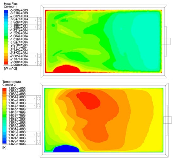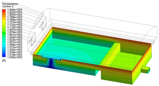 Temperatures and heat flows are iteratively compared until convergence is achieved; however, this coupling method has inherent issues. Specifically, as pointed out by Abbassi and Khoshmanesh [30], due to the “missing information” (i.e., the heat flow or the temperature, depending on the domain considered), it is not possible to obtain the correspondence between the regions of maximum temperature and of maximum heat flow, which is typical of real furnaces. Additionally, the coupling process may require numerous iterations between the combustion space and the glass tank–batch blanket models. These challenges highlight the complexity involved in achieving a realistic and accurate simulation of the interplay between the combustion chamber and the glass bath in a furnace.
