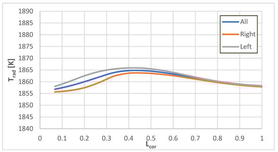Both representations offer a clear depiction of the thermal impact of the flames on the glass. Additionally, upon comparing the previous contours, it becomes evident that the region exhibiting the highest heat flow corresponds to the hottest area. This high-temperature zone extends from the initial section of the furnace up to approximately half of the bath, gradually diminishing in the refinement area. A marked asymmetry is noticeable on the glass surface due to the inlet region of cold glass, which significantly absorbs a considerable amount of heat flow. Higher heat flows are visible in the areas near the salt line, where the corrosion of the higher walls is reflected in the higher measured power loss that is used as a boundary condition. Figure 7 presents the averaged radiation temperature distributions on the interface along the furnace axis. Values are obtained by a transverse average determined on the right/left of the axis, as well as on the entire width.