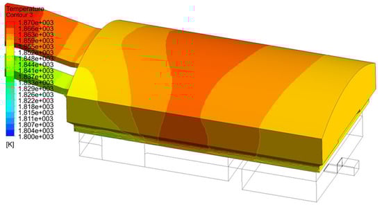 Furthermore, these depictions allow for the clear observation of the peak temperature region within the crown and superstructure, situated just before the midpoint of the furnace, corresponding to the previously identified flames, as previously explained. The numerical values derived from the simulation align well with the experimental measurements, accurately representing the overall temperature trend. A maximum error of about 1.5% has been detected. The combustion model has been validated in previous studies on CH4 diffusive flames with a high-temperature oxidizer [42] and on an experimental IFRF furnace [43]. This validation steps are necessary due to the inherent difficulties of performing detailed measurements in industrial glass furnaces. So, typically, the complete furnace model validation relies on temperature measurements at specific points using thermocouples, as in this case. Building on the proven reliability of the combustion model, an innovative thermal coupling procedure is introduced, overcoming the simplifying assumptions and limitations of other approaches in the literature. This advancement enables a more accurate assessment of the CFD model’s reliability.