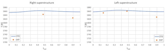 Figure 8 illustrates the temperature contours on the walls of the furnace’s superstructure, including the crown and towers. In parallel, Figure 9 presents the temperature distribution on both the right and left superstructure compared with specific experimental measurement points for reference.