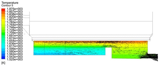 At the throat, the glass temperature obtained from the CFD simulation is 1726 K, while the experimental measurement is 1740 K. This comparative analysis reaffirms the precision of the developed numerical model, demonstrating its high accuracy when juxtaposed with experimental data. For a visual representation, Figure 11 illustrates the temperature distribution in the middle plane of the glass tank, with overlaid velocity vectors for added insight.