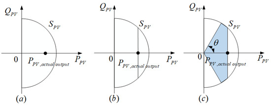 Figure 2. PV inverter’s three control strategies. (a) Maximum active power output control. (b) RPC. (c) OID.The higher the PV active power output, the more the user benefits.According to Figure 2, it can be seen that both control strategies (a) and (b) maximize the PV active power output in the current environment, while (c) sacrifices part of the active power output to obtain the reactive power regulation capability. Therefore, making the PV inverter switch along the sequence (a)→(b)→(c) can satisfy the objective of maximizing the PV active power output, i.e., the objective of maximizing the user benefit.In order to obtain the above PV inverters’ control strategy ((a)→(b)→(c)), the three traditional control strategies were combined and an integrated PV inverters’ control strategy that balances active power output maximization and reactive power regulation was derived. The integrated strategy is modeled as shown in Equations (23) and (24).where .