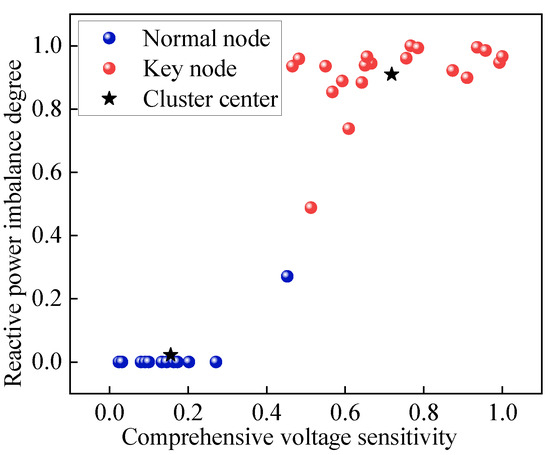 The nodes’ active–reactive voltage sensitivities and reactive power imbalance degrees are positively correlated, and it is hoped that the selected “key” nodes have large values of both indexes, so the two points with the largest and smallest indexes mean values were selected as the initial centers, as shown in Equation (10).