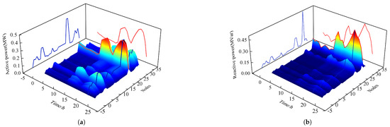 The 24 h active and reactive load curves are shown in Figure 5, and their projections demonstrate the trend of their values over time and over nodes.