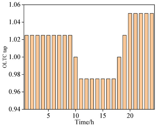 It can be seen from the figure, the low-voltage-side voltages of the OLTC are in the range of 0.975 p.u.–1.025 p.u. and lie between the lower limit of 0.95 p.u. and the upper limit of 1.05 p.u. The number of tap adjustments in a day is 6.