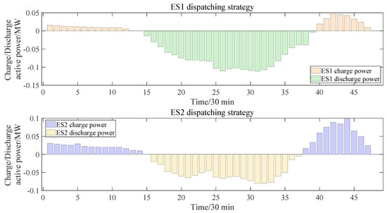 It can be seen that at peak moments the ESs discharge to meet load demand; the rest of the time they charge. The discharging power of ES1 exceeds its charging power can likely be attributed to the relatively heavy load near the node where ES1 is connected. As a crucial power-supplementation source, ES1 is required to release more electrical energy to meet the load demand. In contrast, for Energy Storage 2 (ES2), the similar magnitudes of its charging and discharging powers may stem from the lighter load near the node it is connected to. ES2 mainly serves a fine-tuning function in maintaining the power balance of the distribution network. The reason may be that the load near the node where ES2 is connected is relatively light, and ES2 mainly plays a role in fine-tuning.