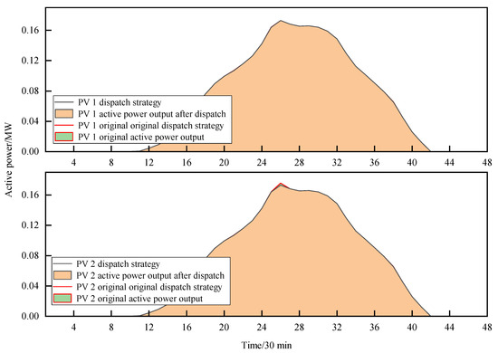 This proves that the PV inverters are actively and continuously playing the role of reactive-power regulation. It can also be seen that before and after dispatching, the active-power output of the PVs is almost unchanged. This is the result of pursuing the maximum PVs active output to ensure the users’ interests. Therefore, the results of the dispatching are satisfactory.