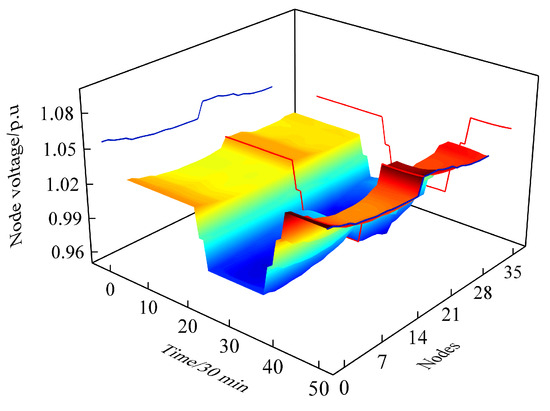It can be seen that the all node voltages specification is between 0.95 p.u. and 1.05 p.u., which are all within the qualified range. In addition, from the perspective of time, it also can be seen that the trend of the node voltages is the same as that of OLTC. This means that the OLTC has a great influence on the node voltages.