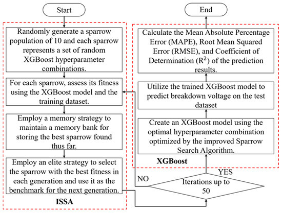 This paper employed the Improved Sparrow Search Algorithm (ISSA) to optimize the hyperparameters of the XGBoost model. The prediction process of the ISSA-XGBoost model is illustrated in Figure 1.