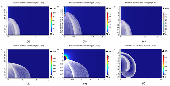The finite element simulations were performed using COMSOL Multiphysics (version 6.2), a commercial software platform widely adopted for electromagnetic field analysis. Two-dimensional axisymmetric simulation models of rod/sphere–plate and rod–rod long air gap structures were established using finite element simulation software for electrostatic field simulation calculations. Triangular elements were employed for mesh discretization, with finer meshing near the high-voltage electrode, ground electrode, and air gap. A potential of 1 V was uniformly assigned to the high-voltage electrode. A rectangular air gap region, defined by a length equal to half the gap length and a height equal to the gap length, was established between the high-voltage and ground electrodes. Streamlines were set within this rectangular region to calculate the electric field strength in both horizontal and vertical directions. The surface electric field strength distribution for different gap structures is shown in Figure 2, where a-c represented rod–plate gap structures with rod tips of conical, open-ended, and hemispherical shapes, respectively; d represented a rod–plate gap structure with a needle-shaped rod; e represented a sphere–plate gap structure; and f represented a rod–rod gap structure, with both rod tips being open-ended.
