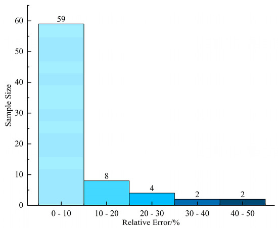 A histogram of the relative errors is shown in Figure 4. In Figure 4, the horizontal axis represents the intervals of relative errors, with each interval having a length of 10%. The vertical axis represents the number of samples whose errors fell within the corresponding intervals. As can be seen from Figure 4, among the 75 test samples, 59 samples had relative errors of less than 10%, 8 samples had relative errors between 10% and 20%, and only 8 samples had relative errors greater than 20%. Nearly 80% of the test samples had relative errors of less than 10%, which validated the effectiveness of the model presented in this paper.