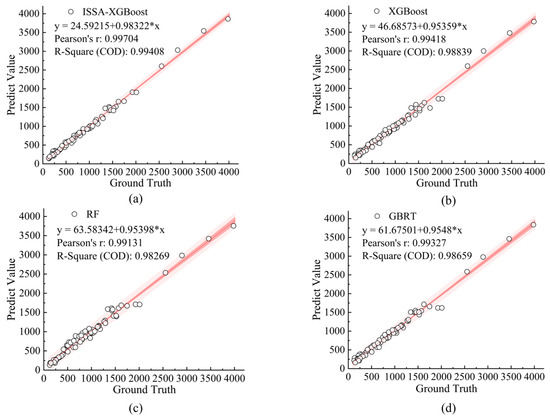 We plotted the regression (R) curve graphs of ISSA-XGBoost compared with other traditional machine learning models, as shown in Figure 6. According to Figure 6, the ISSA-XGBoost model had the highest Pearson’s r and R-Square values, closest to 1. This indicated that the model ISSA-XGBoost proposed in this paper had the highest predictive accuracy and reliability, and the best fitting effect.