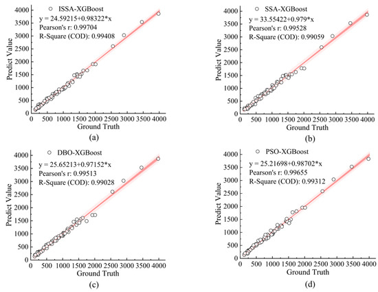 We plotted the regression (R) curve graph of ISSA-XGBoost compared with the other optimization algorithms, as shown in Figure 8. According to Figure 8, when compared with the other optimization algorithms, the ISSA-XGBoost model had the highest Pearson’s r and R-Square values, which were closest to 1. The model ISSA-XGBoost proposed in this paper had the best fitting effect and the best predictive ability.