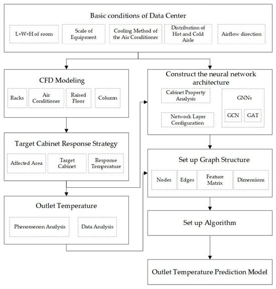 This study proposes a precise air-conditioning control strategy based on the response of the target cabinet’s operating temperature, and then constructs a regression prediction model for the outlet air temperature of the CRAC system. The specific steps are as follows: First, the basic conditions of the data center are analyzed. Based on characteristics such as the air-conditioning cooling method used, the hot and cold aisle distribution, and the equipment model, CFD modeling is performed using the simulation software 6sigmaRoom [11] developed by the UK company Future Facilities Ltd. (London, UK), which has been acquired by American company Cadence in 2022. The impact areas of each CRAC are analyzed, the distribution of target cabinets is determined, and the outlet air temperature of the cabinets is set as the control target. CFD simulation is used to obtain variations in the outlet air temperature and cabinet temperature of the CRAC system, exploring the potential for energy savings. The dynamic load of the data center is simulated, and location factors such as the cabinet arrangement are analyzed. A simulation dataset is created for training the prediction model. The graph neural network algorithm is applied, the network structure is set, and a graph model is built to achieve regression prediction of the CRAC’s outlet air temperature, aiming for the predictive control of air-conditioning outlet parameters. The technical approach is shown in Figure 1.