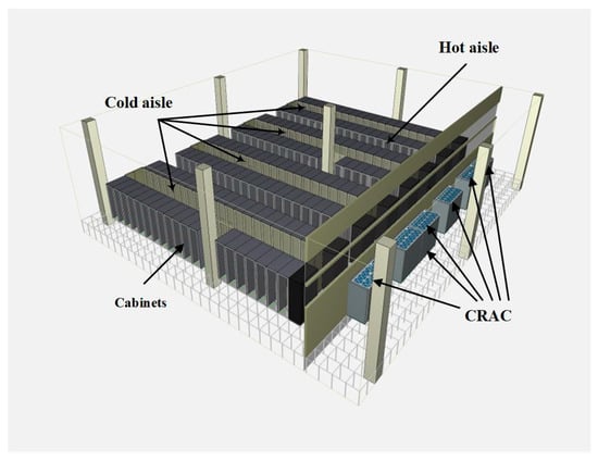 Scholars have proposed various designs of CRAC control systems to improve the energy efficiency of cooling systems. For example, Kleyko et al. [2] proposed a PID controller based on the bacterial foraging algorithm to be applied to CRAC systems, which reduces redundant cooling capacity by improving air-conditioning stability. Haitao Zhou [3] designed an automatic air-conditioning control system for data centers, which improves the stability of the server room and reduces energy consumption by adjusting the temperature and humidity level. Ahmad [4] introduced CI technology and studied the impact of air-conditioning airflow on the airflow changes in server cabinet hotspots, improving the airflow efficiency of the CRAC. Yunyun Wu [5] designed a model based on Model Predictive Control (MPC), which performs real-time energy management by controlling the use of air conditioning and server room power supply. Kwon [6] studied air-conditioning airflow positions and rated the airflow volumes, establishing a server cabinet cooling system. In the study by Yongxian Yi [7], various indoor scenario demands were met by flexibly adjusting the critical minimum set points of the CRAC. Su Zhi [8] aimed to reduce the PUE (Power Usage Effectiveness) and experimentally determined the optimal temperature for air-conditioning supply and return water at +8 °C. Ni Jie et al. [9] achieved energy-saving effects in a CRAC system by adjusting the opening degrees of air valves and water valves in server rooms. Nada et al. [10] investigated the impact of the layout of air-conditioning units in a server room on the overall environment of the room using numerical simulation methods. However, due to the differences in both the rack layout and HVAC (heating, ventilation, and air conditioning) systems among different data center rooms, a single physical model could not comprehensively consider all possible spatial configurations. Therefore, this study uses a simplified approach to establish a data center room model and incorporates it into CFD (Computational Fluid Dynamics) simulation software for calculation. This method can calculate the temperature data at key locations within the server room. Using these data, the correlation between the air-conditioning supply temperature and the cabinet temperature can be established, thus providing feasible solutions for energy optimization. Although this simplified modeling method cannot cover all specific situations, it is sufficient to provide valuable energy-saving insights for most data centers.