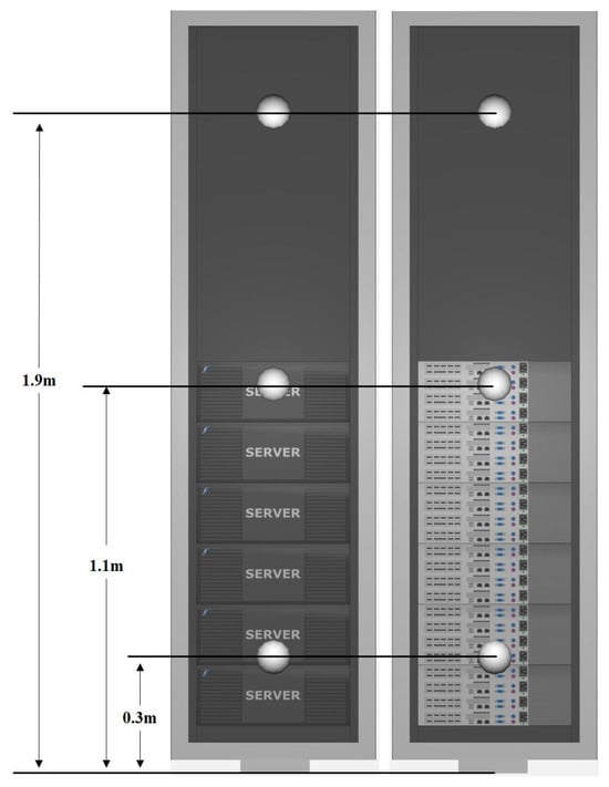 The boundary conditions for the CRACs were set as shown in Table 1. The rated load of the cabinets inside the data center is 4 kW, but the actual average load of each cabinet is 2 kW. Each cabinet can accommodate up to 10 servers, with the server model named HP SE1120. The load of each cabinet is evenly distributed across each server. To achieve precise temperature control for the CRACs, temperature sensors were installed at the ventilation openings at half the height of the cabinets, transmitting the outlet air temperature of the cabinets to the CRAC system. In the actual data center experiment, the temperature sensors were placed at the upper, middle, and lower positions of the air inlet and outlet of each cabinet (shown in Figure 3) to obtain more detailed temperature data. The measurements show that the further a cabinet is from a CRAC, the higher the intake temperature. This indicates that the cooling effect of the CRAC system decreases as the distance from the cabinets increases.