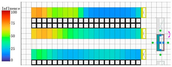 Figure 4 illustrates an example of the impact of target cabinet nodes of the CRAC system on nearby cabinets using the method described above. The impact parameter ranges from 0% to 100%, with red indicating a high impact and blue indicating a low impact. From the figure, it can be seen that the farther a cabinet is from a CRAC, the smaller the impact of the air conditioner on the cabinet.
