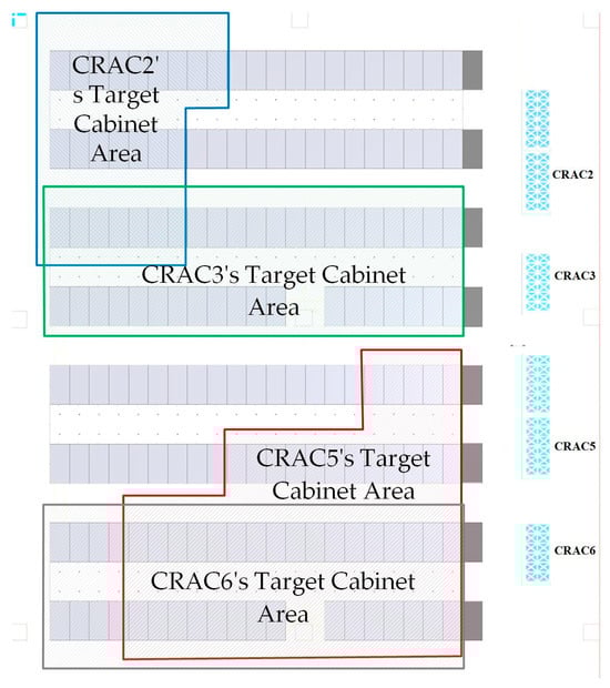 The above method was used to analyze four active CRACs (CRAC2, CRAC3, CRAC5, and CRAC6), and the cabinets with an impact degree ≥ 50% on the CRAC system were selected as the target cabinets for each air conditioner. The sensor temperatures of each cabinet were recorded and used as the response parameters for the corresponding CRACs. In subsequent operations, the CRACs would only respond to temperature changes in the cabinets within the impact area. The specific range of the cabinets’ response to each air conditioner is shown in Figure 5.