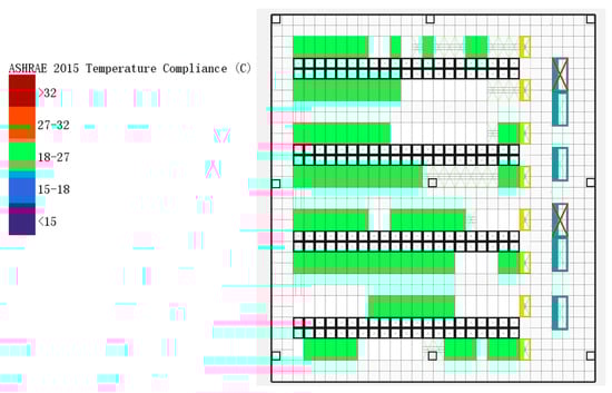 After running the CFD simulation and stabilizing the cabinet temperatures, the presence of any local hotspots was monitored. Figure 6 shows the temperature distribution of the cabinets in the data center. It can be seen that the cabinet temperatures are within the cooling and air-conditioning engineering standard (ASHRAE 18–27 °C), confirming that the cabinets are operating in a safe temperature range. At this point, the outlet air temperature of the CRACs was recorded, and the reduced power consumption was calculated based on the CRAC model. As shown in Table 2, after adopting the control strategy based on the target cabinet temperature as a control parameter, the outlet air temperature of the CRACs was significantly higher than the set temperature based on experience. The average power reduction for the four CRACs was 0.881 kW, indicating that the experience-based control strategy for CRACs in the data center results in overcooling, and has energy-saving potential.