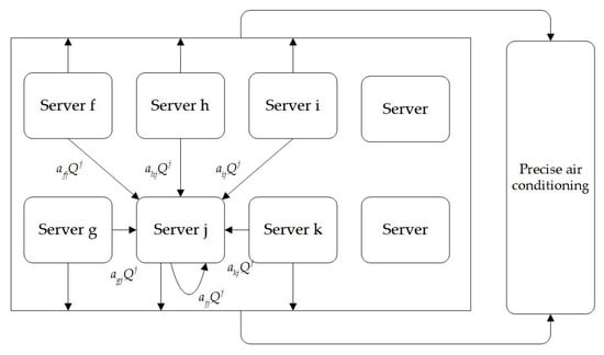 In the airflow distribution inside a data center, there exists an uneven temperature distribution caused by hot air recirculation and cold air bypass. The differences in temperatures between cabinets interfere with each other [13]. The heat generated by each cabinet is not only produced by the cabinet itself, but is also influenced by the heat generated by the other five neighboring cabinets. Additionally, the airflow entering and exiting each cabinet also affects the heat distribution. Assuming each cabinet is a heat source, the thermal recirculation phenomenon can be represented as shown in Figure 7. In the figure, represents the percentage of heat recirculating from the outlet of server i to the inlet of server j, and represents the heat carried by the airflow passing through server j.