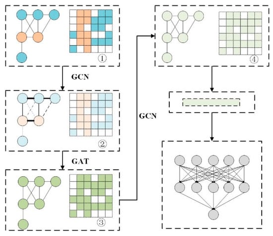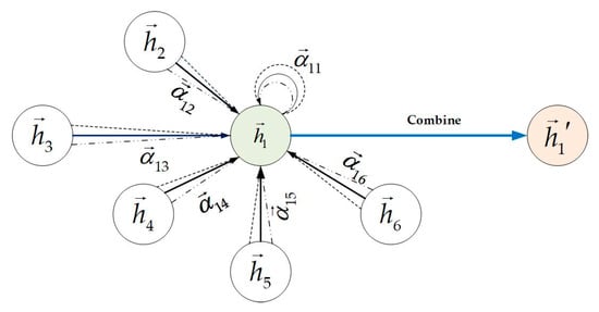 In Equation (13), LeakyReLU is a nonlinear activation function; represents the concatenation of the hidden layers of nodes and , followed by normalization to obtain the attention weight matrix, which is an asymmetric matrix. This asymmetry allows the importance of nodes in the graph to be differentiated. Based on the attention weights , the hidden layers of neighboring nodes are aggregated using a weighted average, resulting in the hidden layer of the node being .