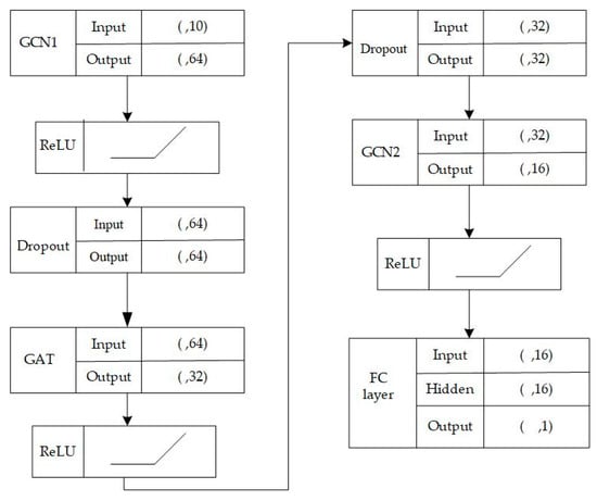 The first layer takes the adjacency matrix and feature matrix as input, with the feature dimension set to 10. After passing through the GCN, the output dimension is 64. In the second layer, a learnable attention matrix, is introduced, and the output dimension is reduced to 32. Finally, another GCN layer is applied, reducing the output dimension to 16. Between each layer, a nonlinear activation function, RELU, is added, and a dropout parameter of 0.5 is set. In the end, a fully connected layer is used, and the output dimension is 1, representing the air outlet temperature. The specific network structure is shown in Figure 10 below.